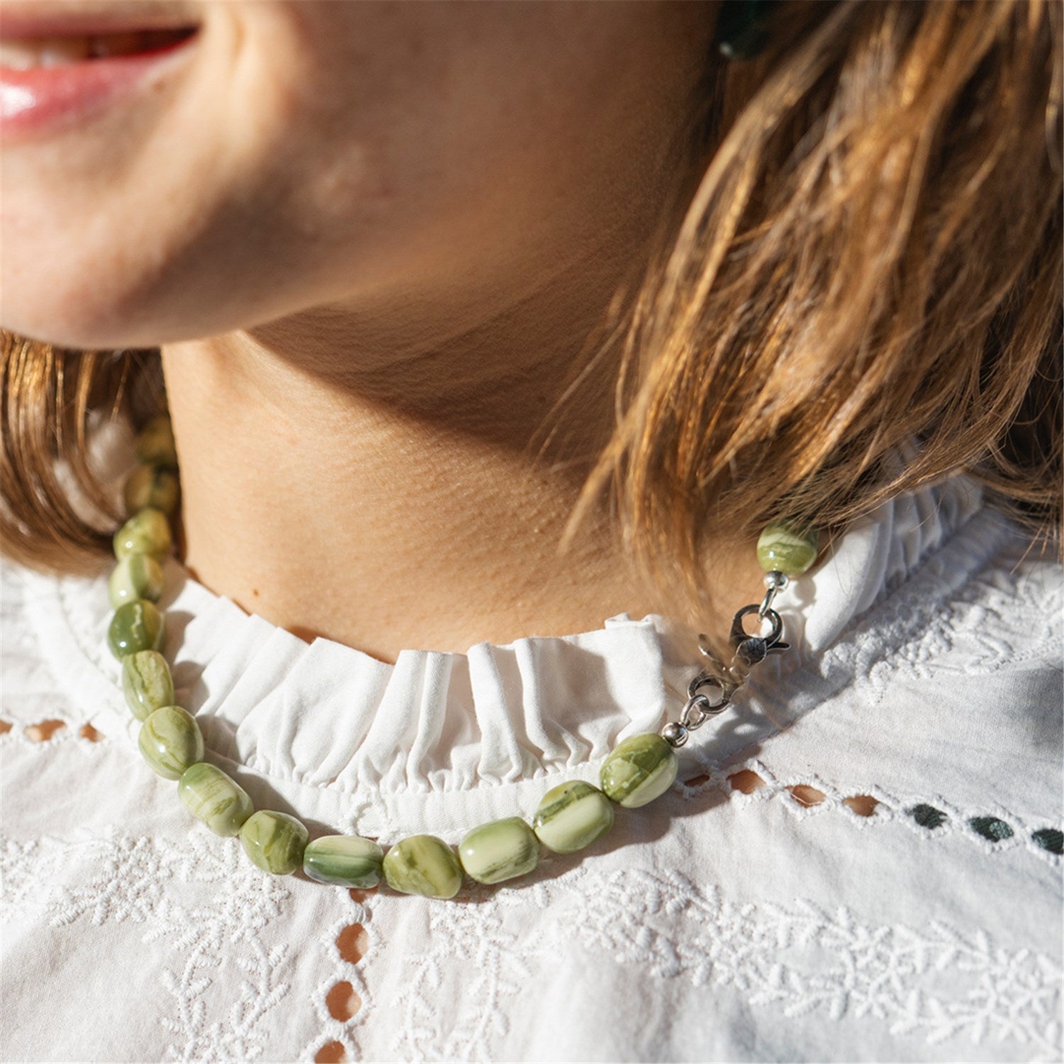 La calcite verde-giallo è una pietra che porta equilibrio e chiarezza. Rinforza l’ottimismo, aumenta l’energia e dona leggerezza e luminosità alla mente – un bel promemoria per trovare calma e positività nella vita quotidiana. La pietra preziosa mostra delicate tonalità di verde e di giallo. Le variazioni naturali di colore e motivo rendono ogni pietra unica e conferiscono al collier un’espressione personale e originale.