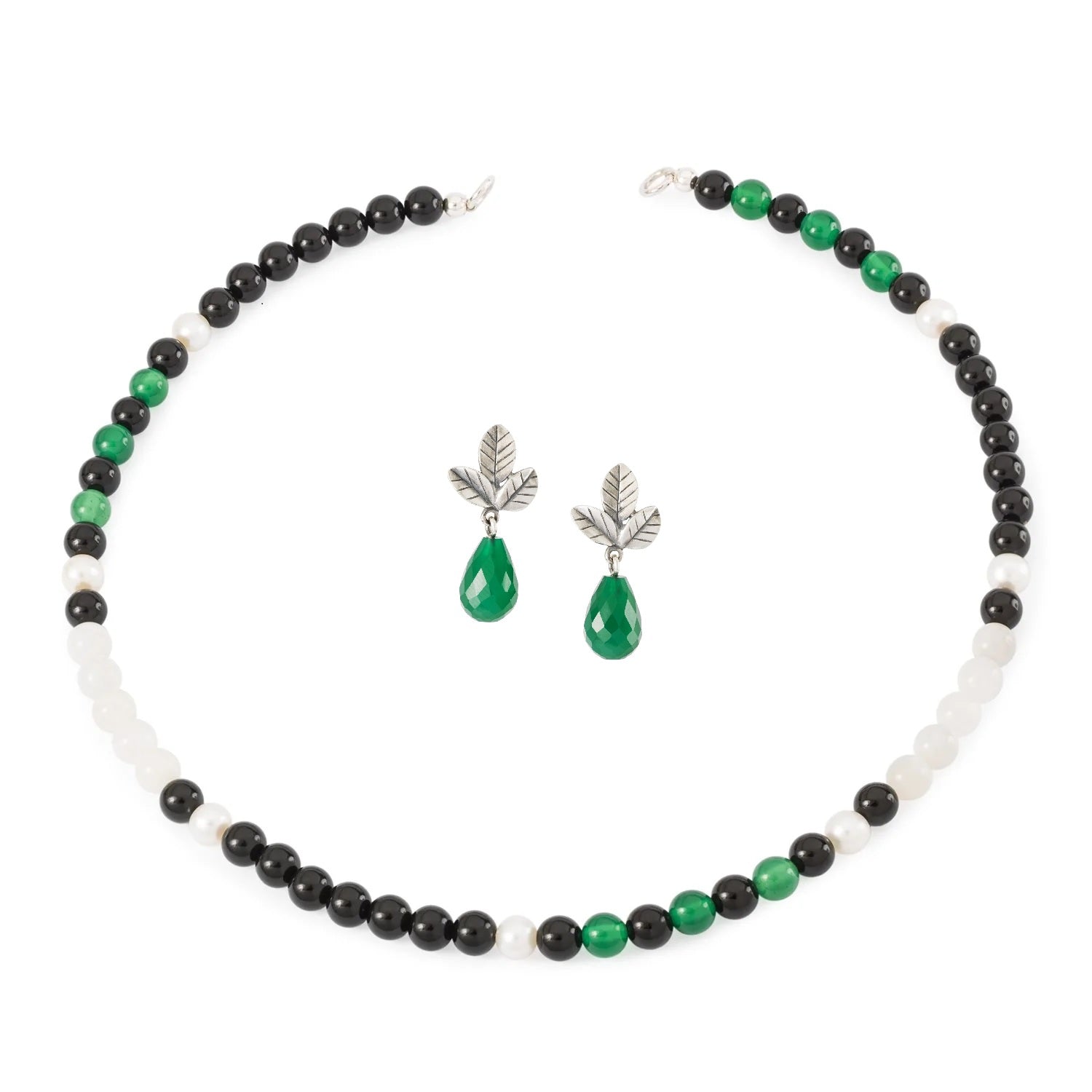 Grüne Träume Set bestehend aus Blätter der Gelassenheit Ohrstecker mit grünem Onyx, Traumhafte Gelassenheit Collier und Basisverschluss.